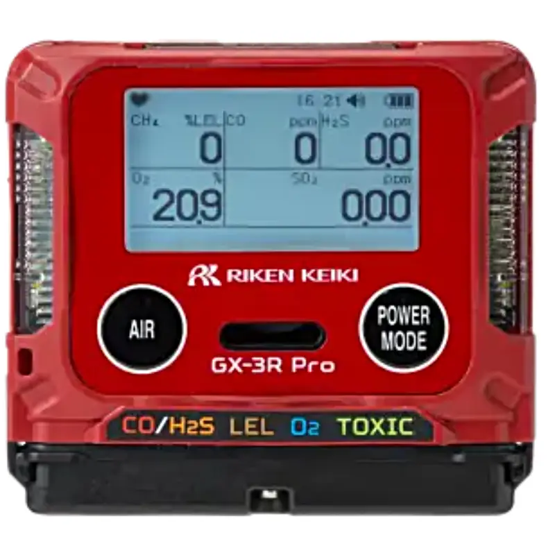 Riken Keiki GX-3R hordozható négygázas detektor. A világ legkisebb és legkönnyebb négygázas személyi gázérzékelője, amely egyidejűleg figyeli az éghető gázokat (LEL), az oxigént (O2), a szén-monoxidot (CO) és a kén-hidrogént (H2S). Mindössze 100 grammos tömegével és kompakt méretével észrevétlen, mégis életmentő viselet a munkaruházaton.